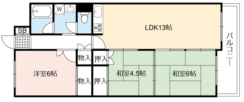 | 間取り詳細 | LDK 13畳 、 洋室 6畳 、 和室 6畳 、 和室 4.5畳 |