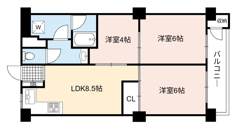 | 間取り詳細 | LDK 8.5畳 、 洋室 6畳 、 洋室 6畳 、 洋室 4畳 |