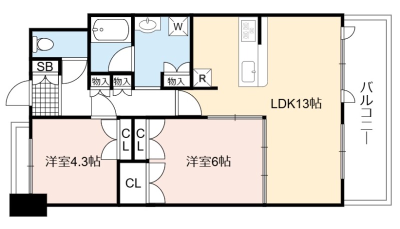 | 間取り詳細 | LDK 13畳 、 洋室 6畳 、 洋室 4.3畳 |