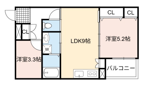 | 間取り詳細 | LDK 9畳 、 洋室 5.2畳 、 洋室 3.3畳 |