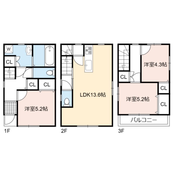 | 間取り詳細 | LDK 13.6畳 、 洋室 5.2畳 、 洋室 5.2畳 、 洋室 4.3畳 |