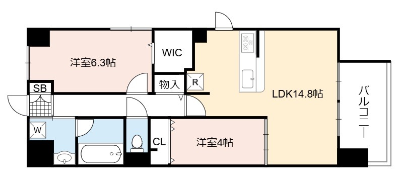 | 間取り詳細 | LDK 14.8畳 、 洋室 6.3畳 、 洋室 4畳 |