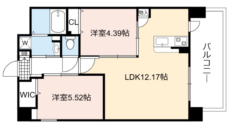 | 間取り詳細 | LDK 12.17畳 、 洋室 5.52畳 、 洋室 4.39畳 |