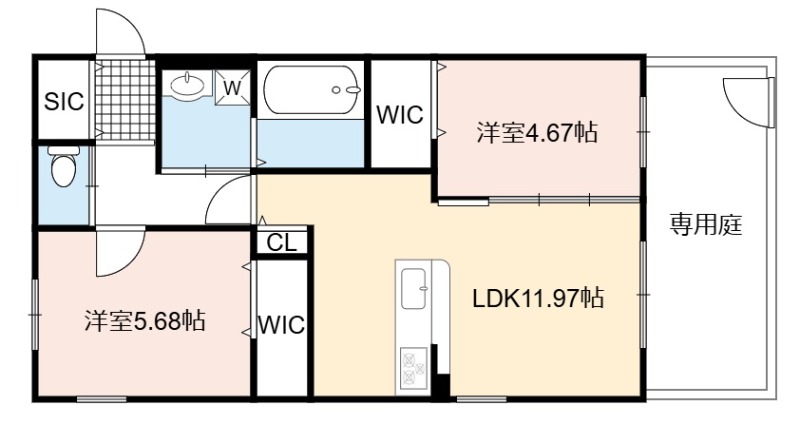 | 間取り詳細 | LDK 11.97畳 、 洋室 5.68畳 、 洋室 4.67畳 |