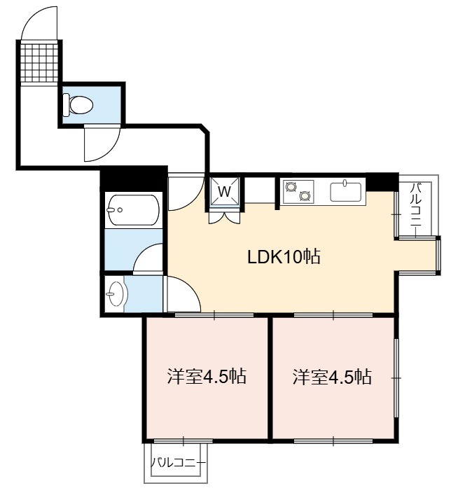 | 間取り詳細 | LDK 10畳 、 洋室 4.5畳 、 洋室 4.5畳 |