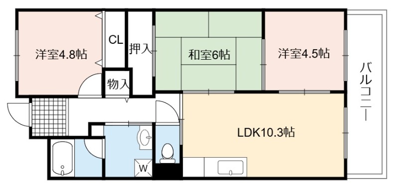 | 間取り詳細 | LDK 10.3畳 、 和室 6畳 、 洋室 4.8畳 、 洋室 4.5畳 |