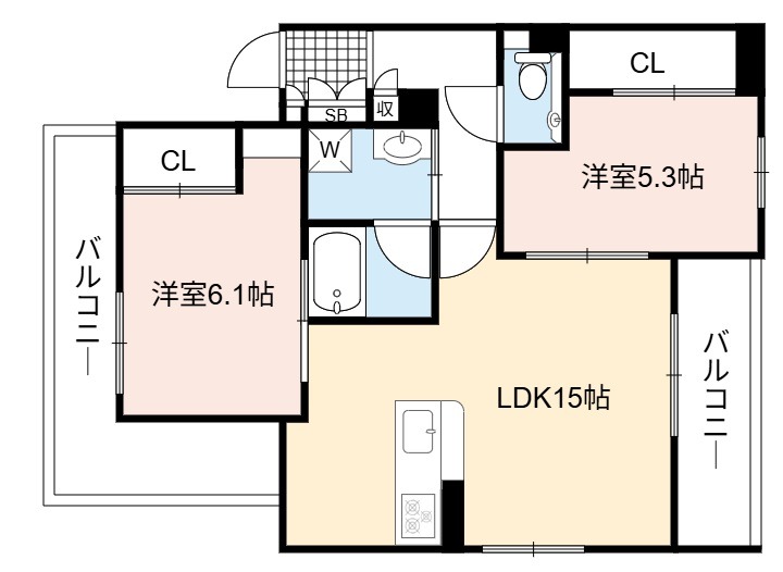 | 間取り詳細 | LDK 15畳 、 洋室 6.1畳 、 洋室 5.3畳 |