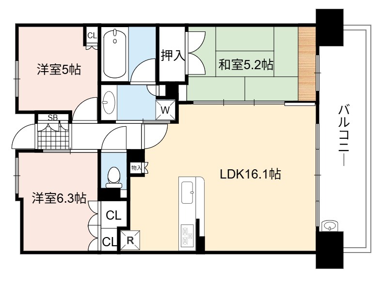 | 間取り詳細 | LDK 16.1畳 、 洋室 6.3畳 、 和室 5.2畳 、 洋室 5畳 |