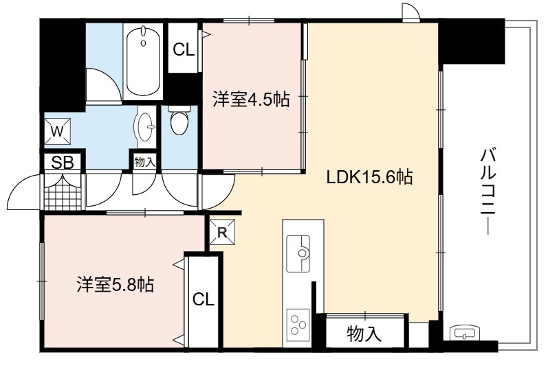 | 間取り詳細 | LDK 15.6畳 、 洋室 5.8畳 、 洋室 4.5畳 |