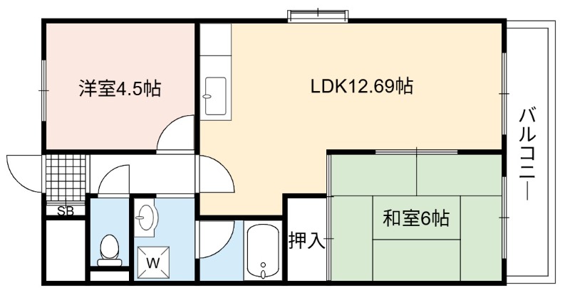 | 間取り詳細 | LDK 12.69畳 、 和室 6畳 、 洋室 4.5畳 |