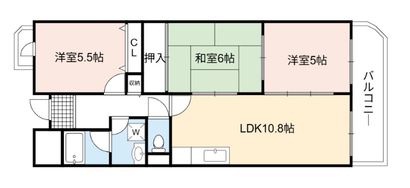 | 間取り詳細 | LDK 10.8畳 、 和室 6畳 、 洋室 5.5畳 、 洋室 5畳 |