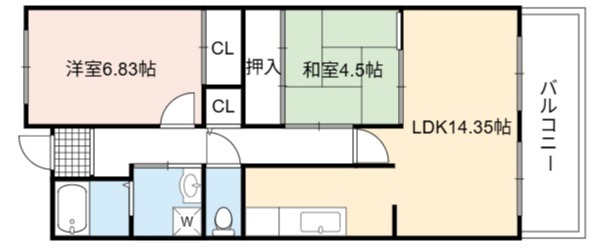 | 間取り詳細 | LDK 14.35畳 、 洋室 6.83畳 、 和室 4.5畳 |