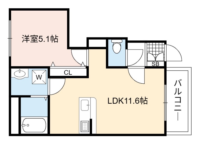 | 間取り詳細 | LDK 11.6畳 、 洋室 5.1畳 |