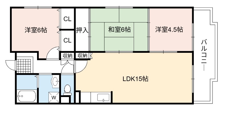 | 間取り詳細 | LDK 15畳 、 洋室 6畳 、 和室 6畳 、 洋室 4.5畳 |