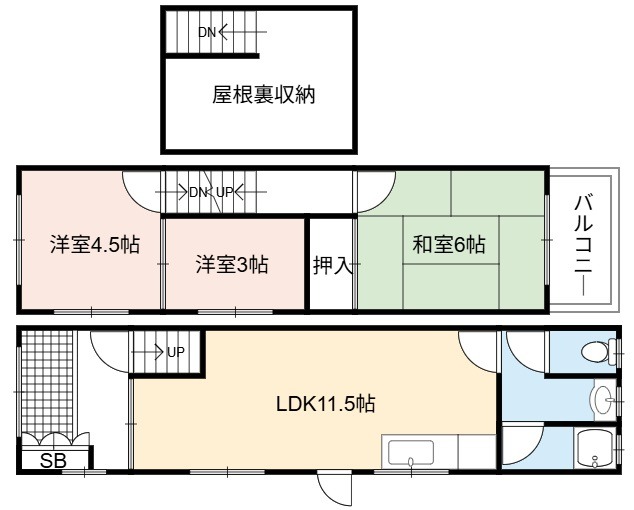 | 間取り詳細 | LDK 11.5畳 、 和室 6畳 、 和室 4.5畳 、 洋室 3畳 |